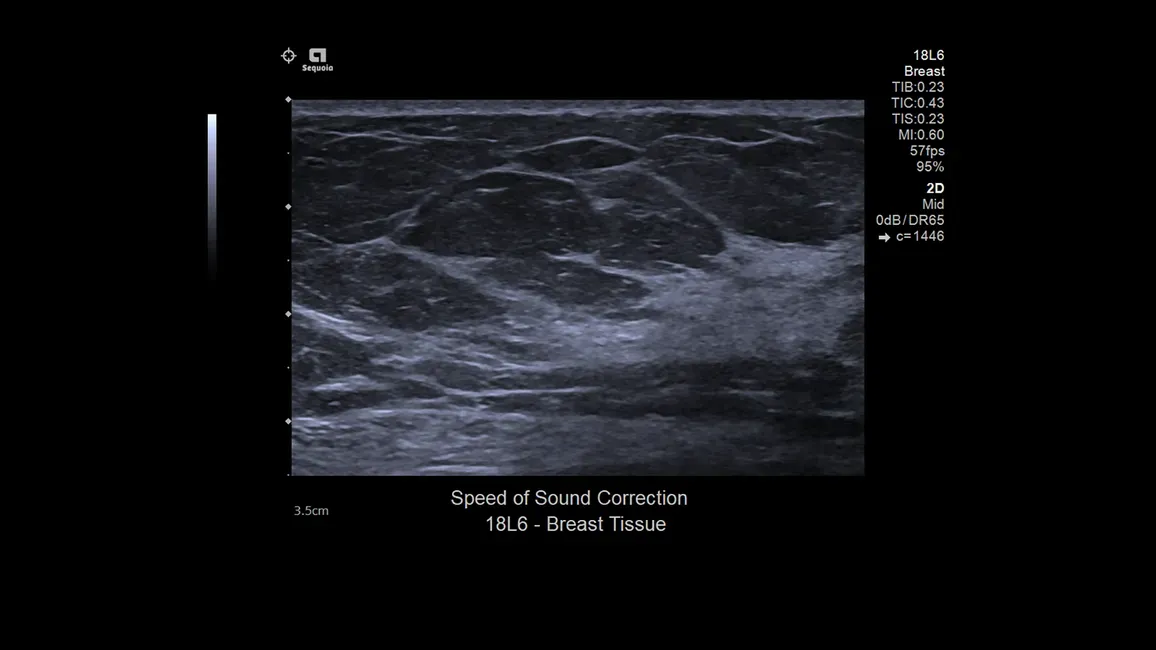 УЗ-система ACUSON Sequoia включает в себя технологию коррекции скорости звука, которая изменяет скорость ультразвуковых волн в зависимости от типа ткани или патологии. Это позволяет улучшить фокусировку, пространственное и контрастное разрешение изображений.